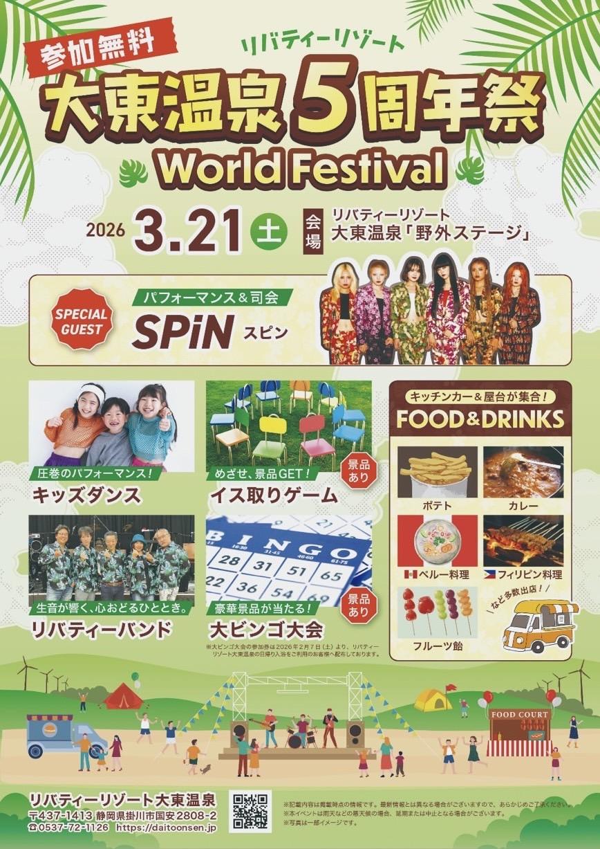 2026年3月21日(土) リバティーリゾート 大東温泉5周年祭 World Festivalに出演いたします!